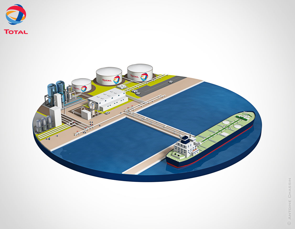 Client/Agence : Total - De Papé Conseils - 2012 - Produit/Sujet : 08 - Tanker au port stylisé en 3d - Production/Support : Panneaux Mondial Auto 2012