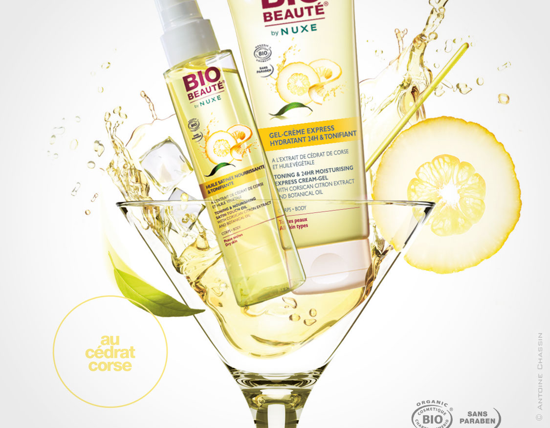 Client/Agence : NUXE - Studio KNAPP - 2015 - Produit/Sujet : verre & gouttes en 3d - Cédrat Corse - Production/Support : Affichette & dépliants